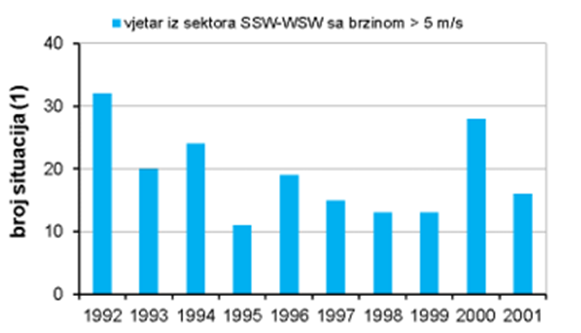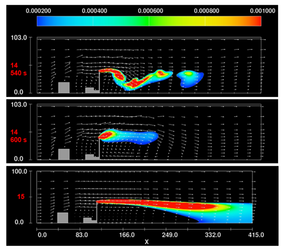 Provedene su numeričke simulacije širenja onečišćenja NO2 iz dimnjaka spalionice primjenom 3D numeričkog modela [2]. Promatrano je djelovanje vjetra u smjeru okomito na os zgrade, a podaci o brzini i smjeru vjetra dobiveni su iz atmosferskog numeričkog modela Aladin-Hr za razdoblje 1992.-2001. Koncentracija (NO2) je praćena na 2 m visine od horizontalnog terena.